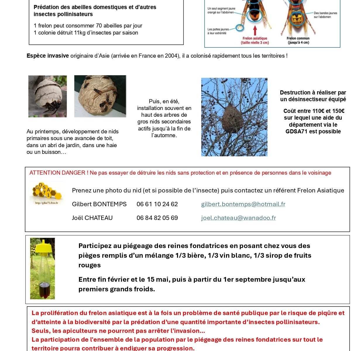 Vous trouverez dans le document ci-joint les éléments qui vous permettront d’organiser le piégeage sur votre commune et aussi des contacts pour signaler les nids ou demander de l’aide.